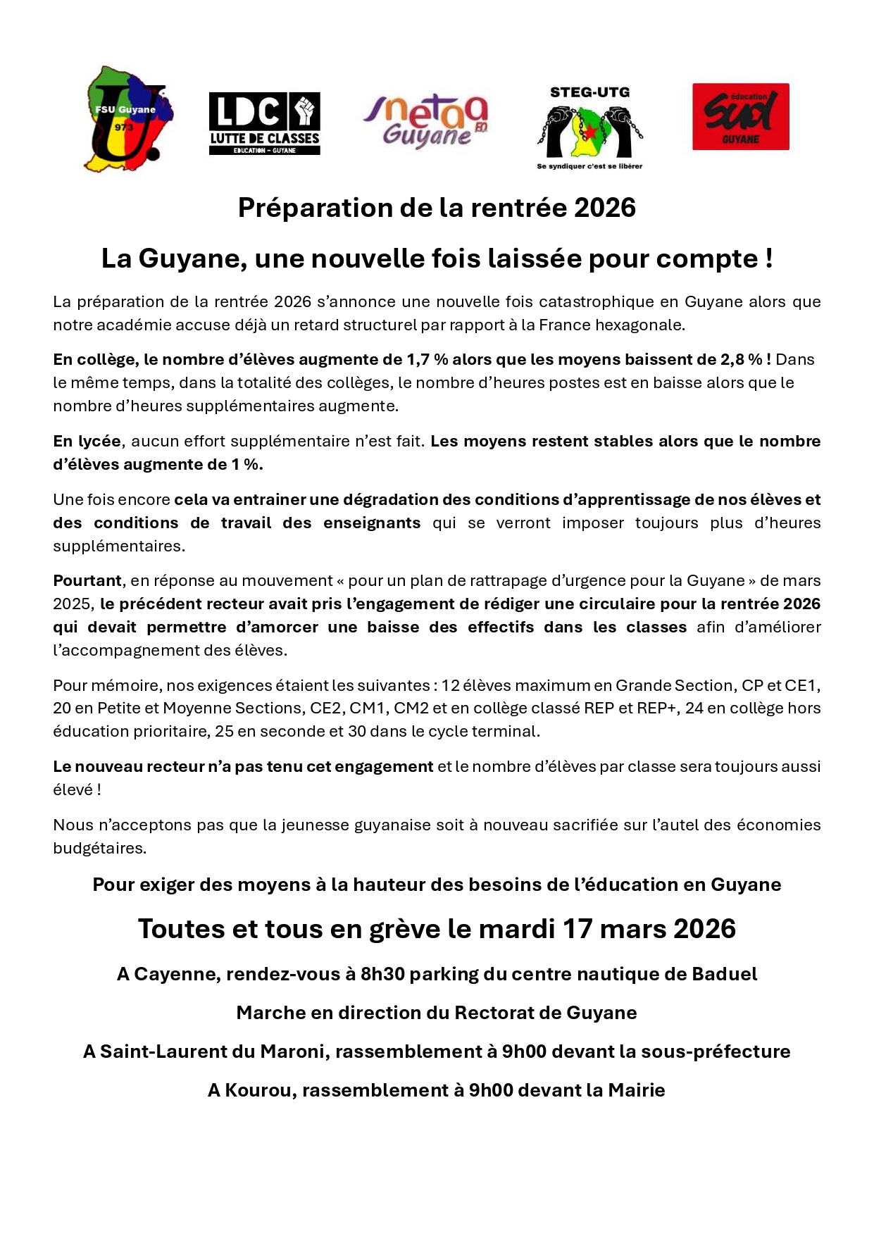 Communiqué de l’intersyndicale FSU, STEG-UTG, SUD Education, SNETAA-FO et LDC Education Guyane
